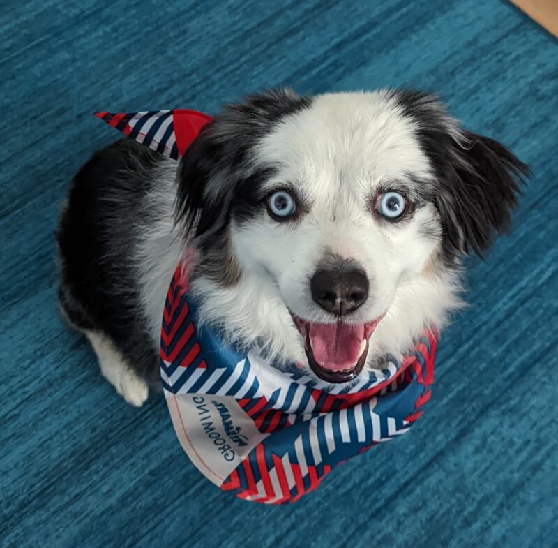 “Miss Emmie Lou is a professional snuggle bug who loves sitting on our patio. She is happiest being included in whatever her favorite people are doing. Sweet, snuggly, treat obsessed Emmie loves to do zoomies, go for hikes and even paddleboard. Emmie has completed our family and we are so lucky to give her the life she deserves!”